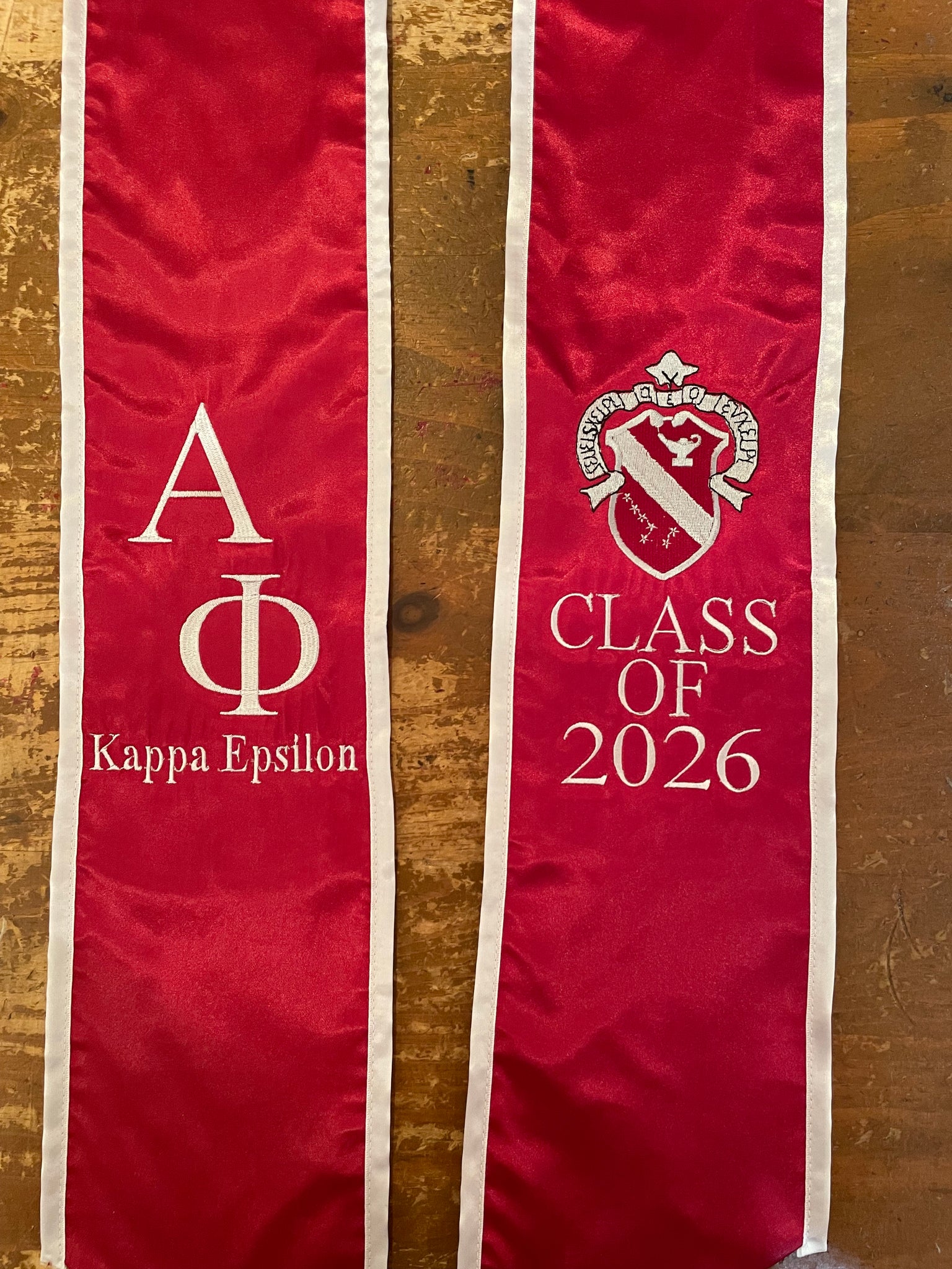 Bordeaux stole with white trim. Alpha Phi letters embroidered diagonally, with KAPPA EPSILON beneath in white (left side facing). Alpha Phi crest embroidered in full color, with CLASS OF 2026 embroidered beneath in white (right side facing).